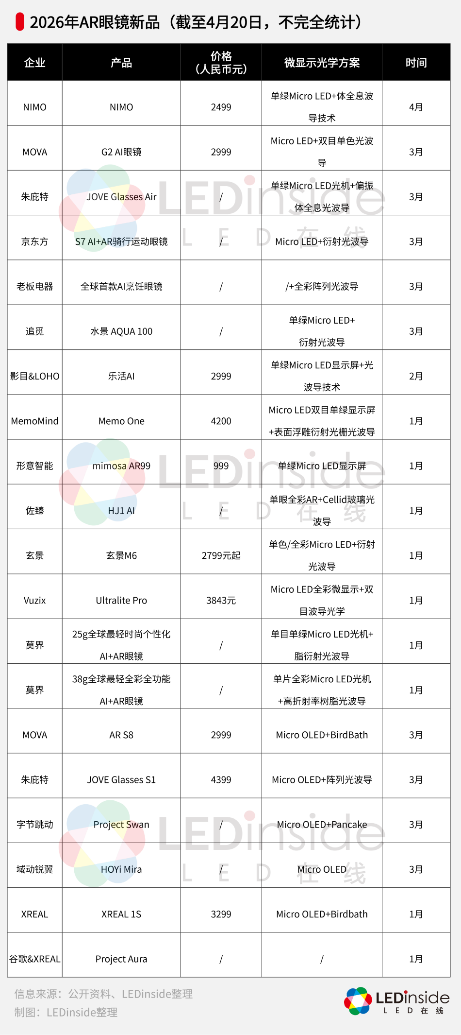 2026年AR眼镜新品发布进入密集期,据LEDinside不完全统计,截至4月20日,今年已有约20款AR眼镜新品发布。