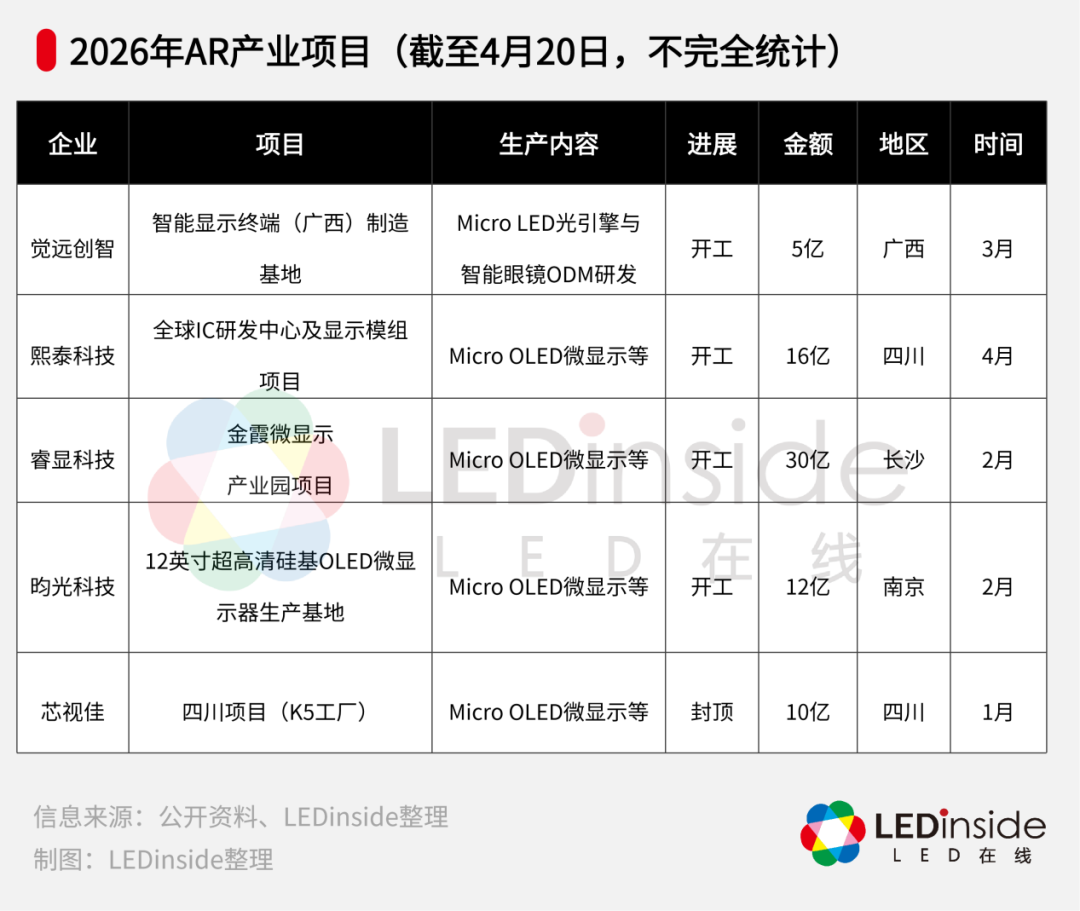 Micro OLED技术方面,多个大规模的生产项目也在2026年进入动工、封顶阶段。