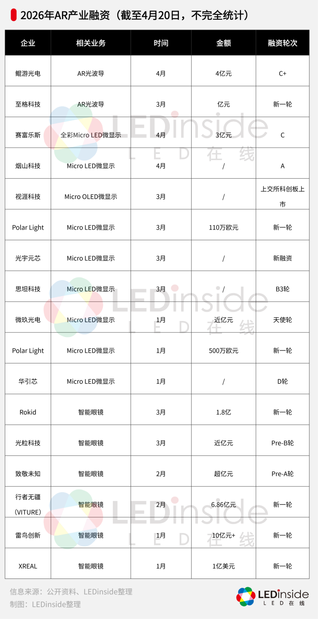 2026年,AR产业的融资动态也异常活跃,资本对核心零部件和终端品牌的投融资力度持续加大。据不完全统计,截至4月20日,仅AR领域就发生了约17起融资事件。