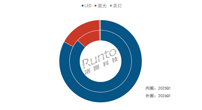 根据洛图科技(RUNTO)线上监测数据显示,2026年第一季度,LED光源在线上市场占据着绝对主导地位,销量占比为82.8%。激光光源的渗透率稳步提升至16.7%,较2025年同期上涨4.1个百分点。汞灯则几乎忽略不计。