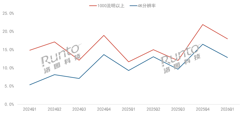 根据洛图科技(RUNTO)线上监测数据显示,2026年第一季度,千流明以上亮度产品的销量份额较2025年同期上涨了6.3个百分点,至18.0%。
