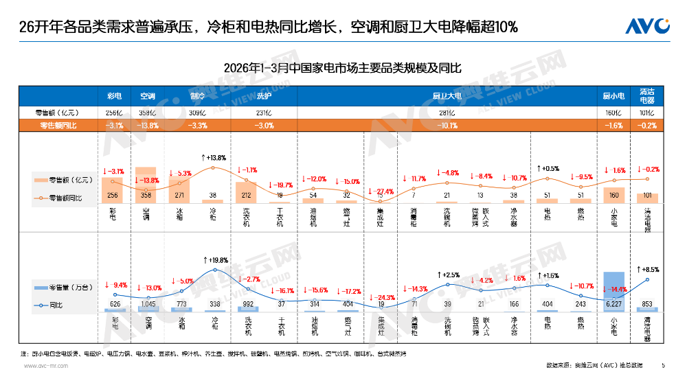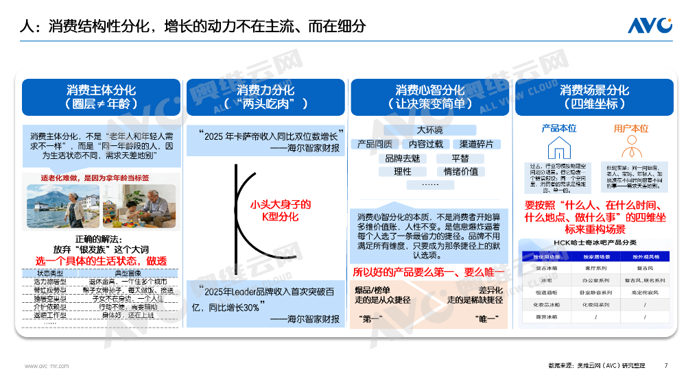 2026年是国补政策延续的第三年,也是AI原生家电落地的元年。2026年是“十五五”开局之年,也是家电行业全面转向高质量发展的关键时期。三年国补,政策的拉动效果显著,但效益也在递减。2024年国补是催化剂,市场增长超预期;2025年国补成为依赖,“无国补不消费”;2026年国补出现“免疫”,“有国补也不消费”。国补没有改变家电产业的存量本质,2026开年行业普遍体感焦虑。奥维云网(AVC)推总数据显示,2026年一季度中国家电产业(不含3C)零售规模1726亿元,同比下滑6.2%,其中3月同比下滑12.5%。接下来的二季度,叠加同期的高基数,降幅或进一步扩大。一季度各个产业普遍承压。奥维云网(AVC)推总数据显示,2026年一季度彩电、空调、制冷(冰箱、冷柜)、洗护(洗衣机、干衣机)、厨卫大电(油烟机、燃气灶、消毒柜、洗碗机、嵌入式蒸烤箱、集成灶、电热、燃热、净水器)、厨小电(电饭煲、电磁炉、电压力锅、电水壶、豆浆机、榨汁机、养生壶、搅拌机、破壁机、电蒸炖锅、煎烤机、空气炸锅、咖啡机、台式微蒸烤)、清洁电器零售额同比分别为-3.1%、-13.8%、-3.3%、-3.0%、-10.1%、-1.6%、-0.2%。细分来看,大型家电中仅冷柜和电热零售额实现同比增长。冷柜受春节气温因素拉动(25年春节是“四九”、“五九”,26年春节已是“七九”),电热则因补贴政策的下沉拉动(过去两年国补拉动一二线燃热换新,26年随着国补向三四线的渗透,促进电热换新)。与市场体感不同的是,今年的AWE异常火爆。人多、车多、机器人多、AI元素多……AI加持下,家电产业正在从旧秩序迈向新体系,只是旧秩序尚在运转、新体系还未完全建立。其一,竞争的边界在消融,但山头未定。传统巨头凭规模、渠道、品牌认知守住基本盘,品类壁垒分明;同时跨界者涌入,全屋智能成终极战场,但“入口”未定,无人确立核心优势。其二,旧红利在消失,新范式尚未可知。主流渠道用户失联,家电高客单、重体验和强信任背书依然是难以绕开的环节;同时兴趣电商、直播、私域流量崛起,品牌陷入“不做没声量,做了没利润”的困境。其三,参数内卷、体验断层。以硬件参数为核心的价格内卷依然突出;同时软件、硬件、服务闭环尚不成熟。未来已来,只是远远的能看到,我们要走的路还有很长。消费者的角色正在从“被满足者”变为“需求定义者”,供需错配的矛盾激化。家电市场话语权从产品主导到渠道主导,再到用户主导的演变,是行业发展、技术进步、市场竞争以及消费者需求变化等多种因素共同作用的结果。中国消费者正经历从“被动满足”到“主动选择”,最终走向“自我定义”的深刻变革。企业竞争层面,分层分化。2025年财报已经陆续发布,增长的企业不多。整体来看,可以大致概括为“五出”。第一层是最顶尖的头部企业,正在多元化“出圈”,通过能力迁徙跳出家电行业,比如美的集团的ToB业务。第二层是腰部品牌,一方面全球化“出海”,另一方面差异化“出众”。第三层则是长尾品牌,正在面临同质化“出局”。用户需求层面,结构性分化。其一,消费主体的分化。这种分化,不是老年人和年轻人需求不一样,而是同一年龄段的人,因为生活状态不同,需求天差地别。比如适老化,是行业共识,但是没有做的非常好的企业,因为行业把他们按照简单的年龄划分了。真实的银发人群也分为活力旅居型、带娃操劳型、独居空巢型、介护依赖型、返聘工作型等等。我们要做的是放弃“银发族”这个大词,选一个具体的生活状态,做透。其二,消费力分化。小头大身子的K型分化,高端与低端两头发展、腰部萎缩的现状。据海尔智家财报,2025年卡萨帝收入同比双位数增长,同时Leader品牌收入首次突破百亿,同比增长30%。其三,消费心智的分化。这种分化的本质,不是消费者开始算多维价值账,是信息爆炸。但人性不变,企业不用满足所有维度,而是要让决策变简单,要成为人性捷径上的默认选项。之所以说好的产品要么第一、要么唯一,是因为第一或者说榜单走的是从众捷径,消费者更容易信任大众的选择,而唯一走的是稀缺捷径,消费者根本不用选。其四,消费场景分化。过去,行业习惯按物理空间划分场景。但它隐含一个错误假设:同一个空间里,消费者的需求是稳定的、单一的。而现实是:同一间厨房,老人、宝妈、年轻人、加班族在不同时间做着不同的事——需求天差地别。所以,我们建议企业的场景化要按照“什么人、什么时间、什么地点、做什么事”的四维坐标来重构。产品供给层面,加速“软化”。因为生活方式、AI技术的变化, 家电产品开始 “软表达”、比拼“软实力”。其一,产品命名从符号化走向任务化。比如大冰象,一次能装下一头大象,满足囤货的任务。其二,产品功能从叠加走向专业。比如多系统冰箱、分区洗衣机,表面是多个风机、多个滚筒的叠加,但实际是不串味、更干净。其三,产品外观从嵌入走向美学。比如隐形油烟机,嵌入的表达解决的还是空间融合,而隐形开始走向系统美学。其四,产品价值从功能溢价走向情绪与信任溢价。比如卡萨帝,“高端家电首选”是一种信任。其五,产品形式从硬件走向服务。未来的硬件会越来越平价,但服务和广告能赚钱。其六,产品迭代从静态固化走向可进化。比如OTA驱动的系统升级,未来的家电和手机一样可以无限升级。流通渠道层面,深度融合。“三场一体,
