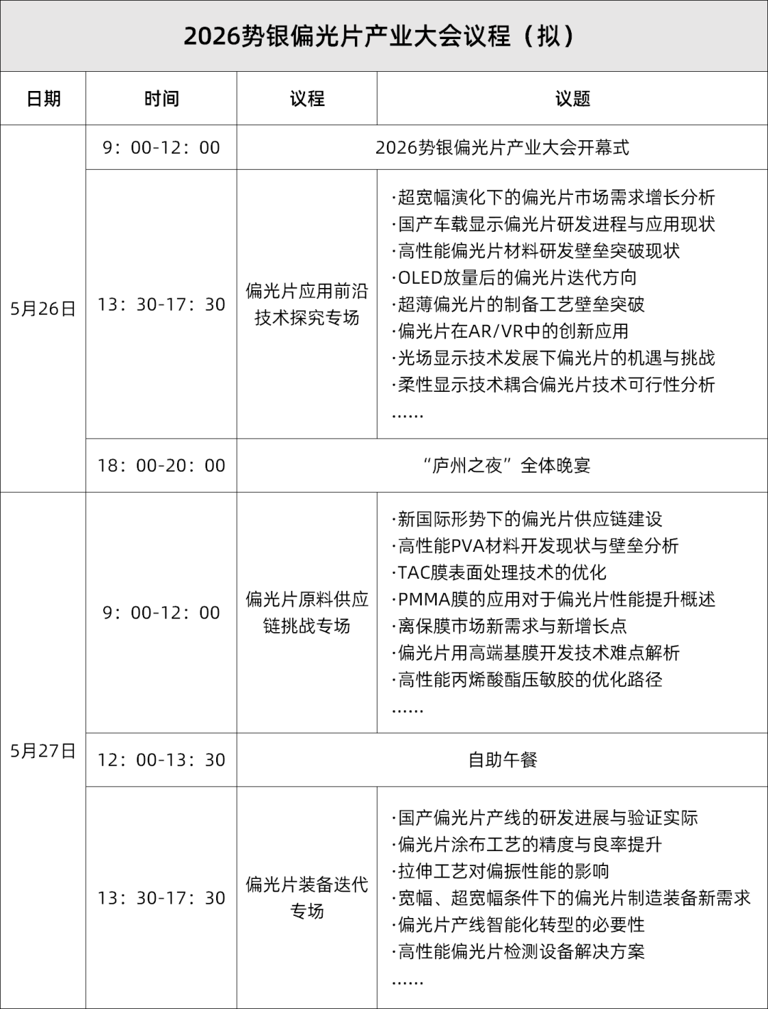 会议时间、酒店正式确定 | 2026势银偏光片产业大会(5月26-27日,安徽合肥)