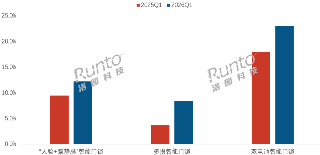 今年以来,长效续航的需求持续走高,门锁市场的双电池产品销额增长明显。根据洛图科技(RUNTO)线上监测数据显示,2026年第一季度,搭载“双电池”方案的产品销量占比达23.0%,同比增长5.0个百分点。