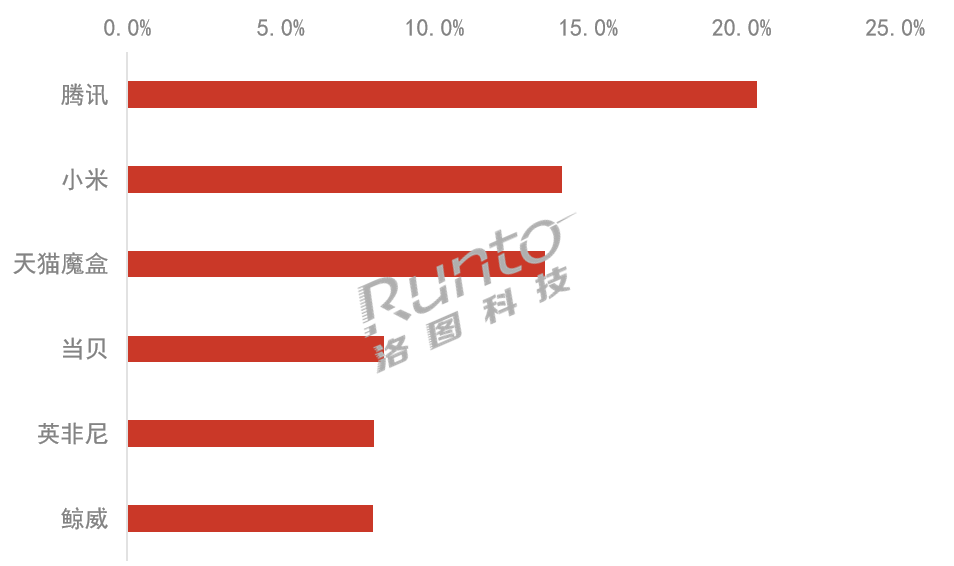 腾讯以20.5%的市场份额继续领跑主流电商市场,核心优势在于内容生态完善、产品能力突出。依托视频平台、云服务以及游戏内容资源,腾讯系盒子能够在内容分发与用户运营上形成闭环。同时凭借8K超高清、杜比视界、杜比全景声、HDR Vivid、DTS等前沿技术,构筑起综合的产品竞争力。