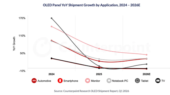 从整体OLED市场来看,2026年出货量预计将保持平稳。显示器市场预计增长45%,平板市场增长13%,汽车显示领域也有所贡献。但这些增量将被智能手机市场的疲软所抵消,手机仍是OLED面板最大的应用领域,其表现直接决定了整体市场的走向。Counterpoint Research称,内存价格上涨,导致成本增加,成本压力传导至终端售价,抑制了部分消费者的换机意愿。