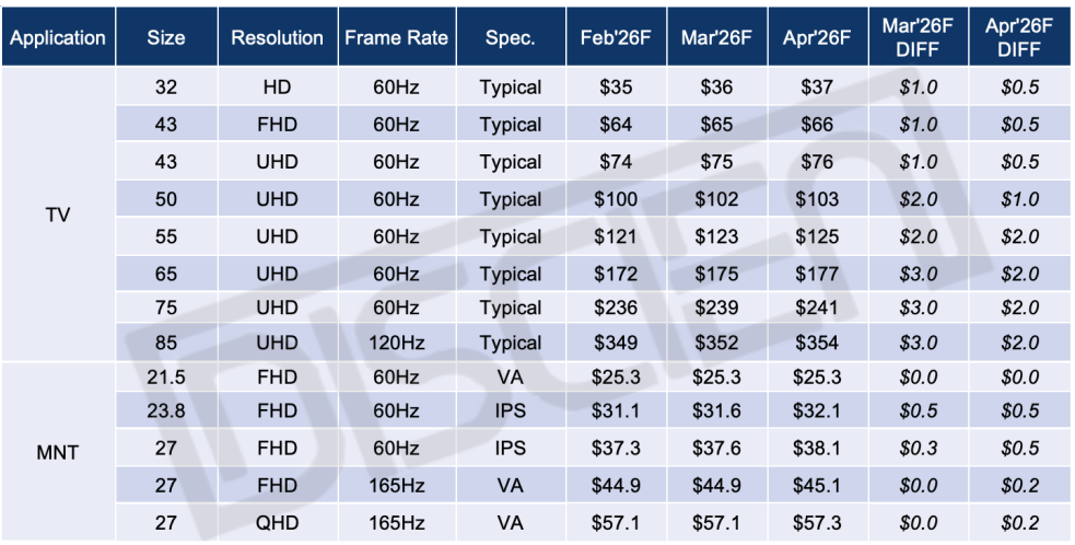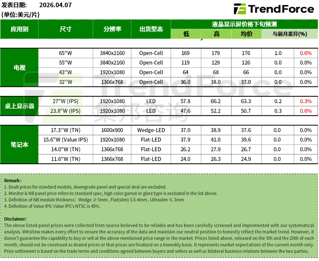 面板价格观察 - 4月4月7日,TrendForce集邦咨询公布了4月面板价格趋势预测:2026年4月,电视面板部分尺寸、显示器面板价格预计上涨,笔电面板价格预期持稳。具体内容如下:1 电视面板 进入4月份,观察部分品牌仍维持电视面板需求,尤其是大尺寸面板的需求,与此同时,受国际形势影响引发的能源问题以及半导体产能排挤效应的影响,面板零部件成本持续上扬,因此面板厂在面板价格态度上表现得更为积极,希