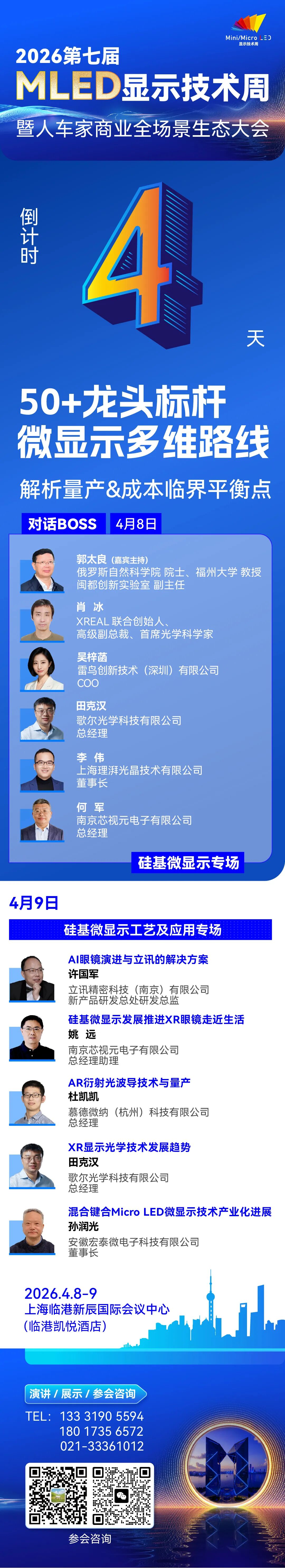 硅基微显示闭门研讨会×对话BOSS 硅基微显示专场×主题演讲 硅基微显示工艺及应用专场2026 硅基微显示产业最前沿一网打尽!| 第二届硅基微显示闭门会第二届硅基微显示工作组闭门会由中国电子视像行业协会微发光二极管显示产业分会(CMMA)和硅基微显示工作组组长单位芯视元联合组织,本届会议将围绕硅基MicroLED彩色化路径、混合键合工艺、彩色AR眼镜技术路线及光学性能、MicroLED智能大灯电气
