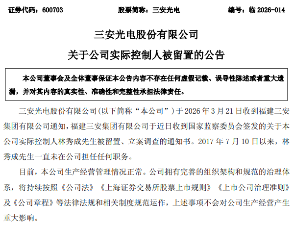3月22日晚间,三安光电(600703)公告,公司于2026年3月21日收到福建三安集团有限公司(简称“三安集团”)通知,三安集团于近日收到国家监察委员会签发的关于公司实际控制人林秀成被留置、立案调查的通知书。目前公司生产经营管理正常,拥有完善治理结构,该事项未对公司运营造成重大影响。公司将持续披露后续进展。今天早盘,三安光电股价开盘一字跌停,报14.89元/股,最新总市值743亿元。根据三安光电