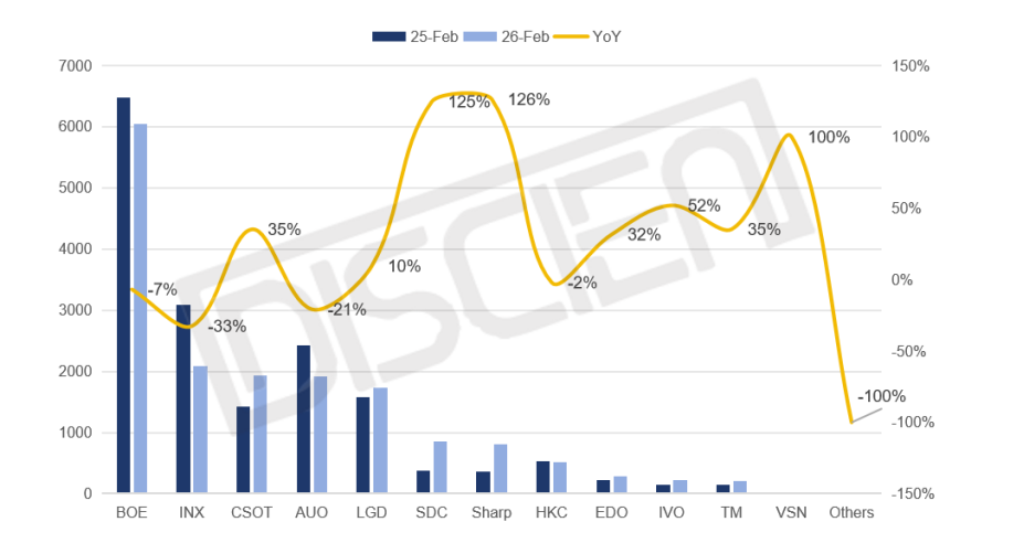 2026年2月,全球NB面板市场在品牌库存持续走高与加单节奏放缓的双重影响下,出货量呈现环比回落。根据DISCIEN数据显示,2月全球NB面板出货量达16.6M,环比减少11%,同比微降1%。环比下滑主要系品牌采买节奏回归常态,短期拉货动能减弱。同比微降1%,与去年同期基本持平,显示市场虽有回调但整体需求仍具韧性。值得注意的是,CSOT凭借Dell品牌加单与HP突破开始量产,出货规模首次跻身全球前