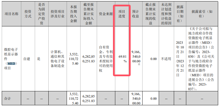 3月30日,莱宝高科发布2025年年度报告。报告期内,公司实现营业收入59.87亿元,同比增长1.56%。实现归属于上市公司股东的净利润2.45亿元,同比下降34.54%。实现归属于上市公司股东的扣除非经常性损益的净利润2.45亿元,同比下降33.66%。在这份年报中,莱宝高科提到了浙江微腔电子纸显示器件(MED)项目的最新情况。截至报告期末,项目累计实际投入金额62.83亿元,建设进度已完成69