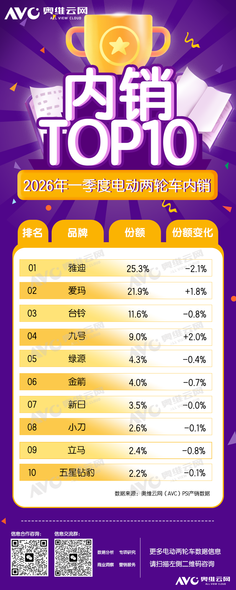 2026年第一季度为我国电动两轮车新国标全面切换后的首个完整季度,市场整体呈现下行态势。受2025年同期“以旧换新”政策持续拉动形成的高基数影响,2026年一季度终端消费疲弱,市场下滑已成定局。据奥维云网(AVC)PSI产销数据显示,2026年第一季度电动两轮车市场内销同比下滑17.1%,其中3月单月同比下降8.9%,较2月降幅已出现显著收窄。尽管消费端阶段性表现偏淡,但市场长期需求基础依然稳固。