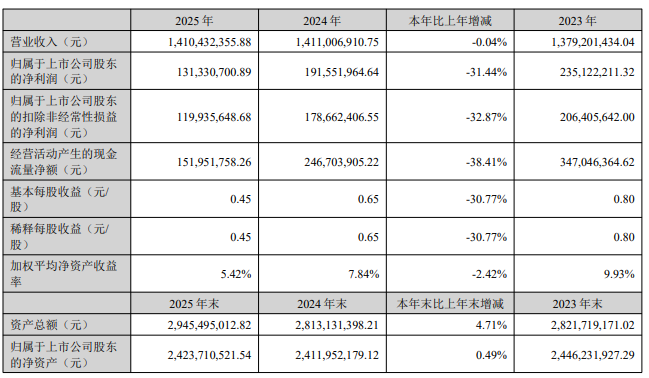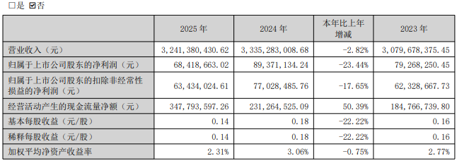3月29日,深纺织A(000045.SZ)公告,2025年营业收入约32.41亿元,同比减少2.82%;归属于上市公司股东的净利润约6842万元,同比减少23.44%;基本每股收益0.14元。公司2025年度利润分配预案拟每10股派发现金股利0.48元(含税),合计派现2431.30万元,占2025年度公司实现的归属于上市公司股东净利润的35.54%。报告期内,公司聚焦偏光片主业,通过优化产品结构