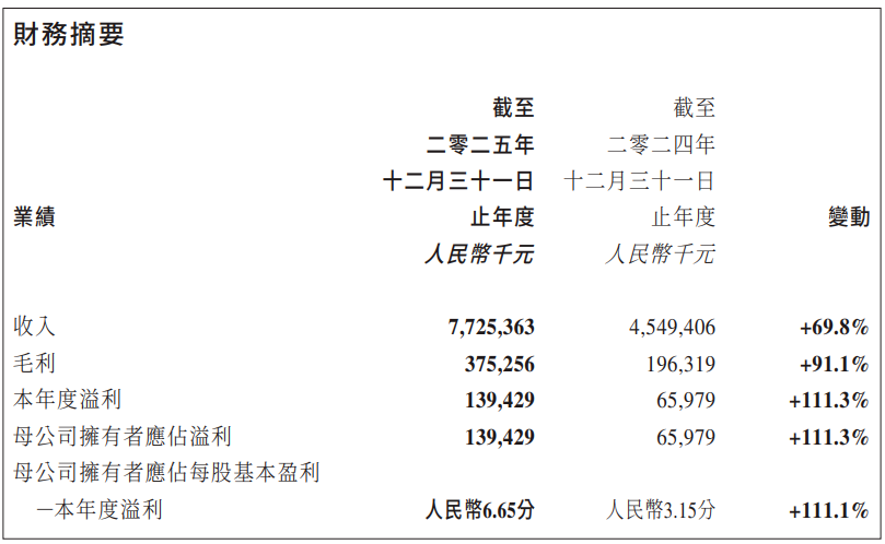 3月27日,华显光电(HK0334)发布截至2025年12月31日止年度业绩,该集团取得收入77.25亿元(人民币,下同),同比增长69.8%;母公司拥有者应占溢利1.39亿元,同比增长111.3%;每股基本盈利6.65分。回顾期内,受产品多元化策略及品牌客户订单稳定增长的推动,集团业务实现高速增长,总销量达8910万片,同比增长80.6%,带动整体营业额显著提升69.8%,达人民币77.25亿元