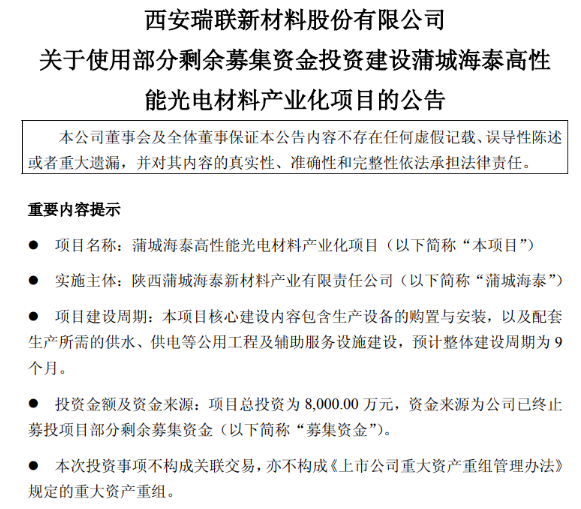 3月26日,瑞联新材公告,公司拟使用液晶项目的部分剩余募集资金8,000万元投资建设蒲城海泰高性能光电材料产业化项目。项目实施主体为瑞联新材全资子公司蒲城海泰,将依托蒲城海泰已建成的311#车间开展建设,该车间已完成房屋主体、墙面屋面等建筑及装饰工程施工。项目拟结合车间布局使用其中部分场地,311#车间总占地面积1,648.32㎡,项目规划用地面积1,018.08㎡。项目计划总投资金额为8,000