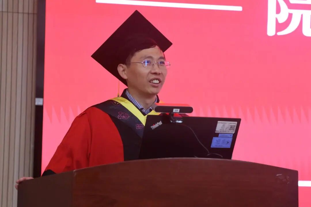 研究生最满意教师王锦程教授作为导师代表发言。他结合自身治学与育人经历,叮嘱同学们既要保持钻研求索的科研态度,也要怀揣感恩之心、坚守做人底线,无论身处何种岗位,都要永葆求知热情,同时也希望大家关注母校发展,常回家看看。