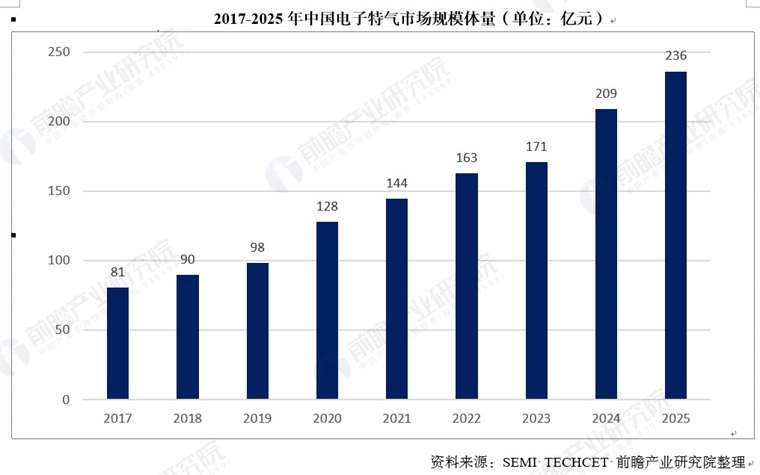 电子特种气体作为半导体、集成电路、显示面板等电子工业的关键原材料,随着半导体产业对高品质、高纯度的电子特气需求不断增长,市场规模持续扩大。前瞻测算,中国电子特气市场连年增长,2025年规模约为236亿元。