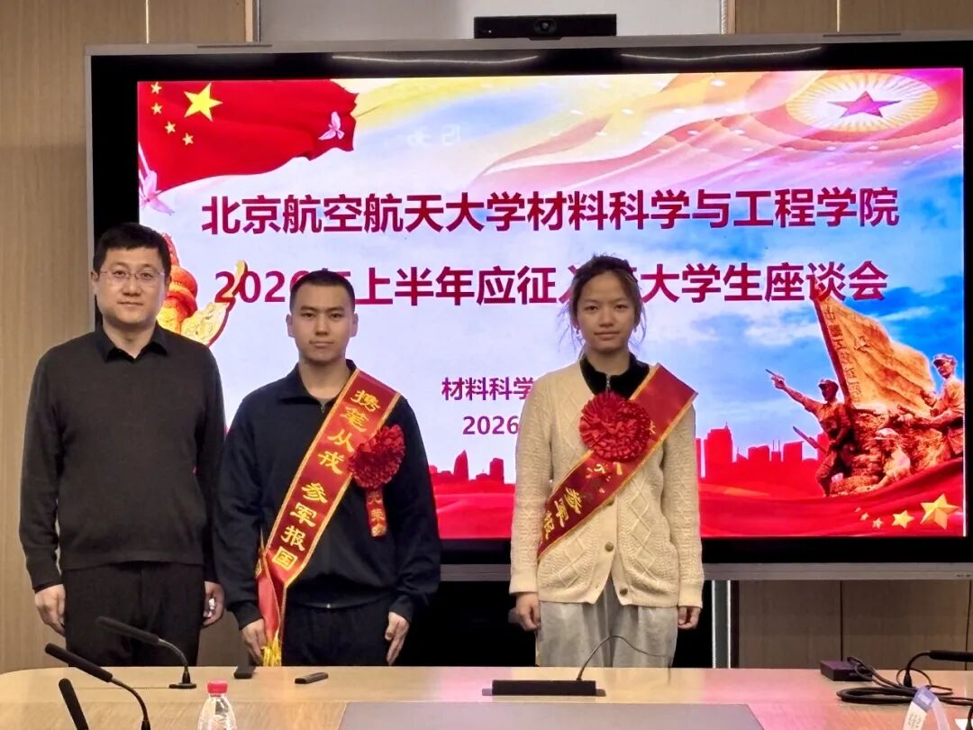 最后,郭洪波代表材料学院向符合应征入伍条件的准新兵表示祝贺,并表示学校和学院是两位同学的坚实后盾,将全力支持应征入伍及后续工作以解决后顾之忧。他指出参军入伍、无上光荣,军营是锤炼意志、淬炼品格的大熔炉,希望两位同学珍惜来之不易的机会在军营中刻苦训练、刻苦钻研,把“空天报国”、“材料强国”的精神带到军营,将专业所学与国防建设紧密结合,用实际行动彰显北航学子的责任担当。