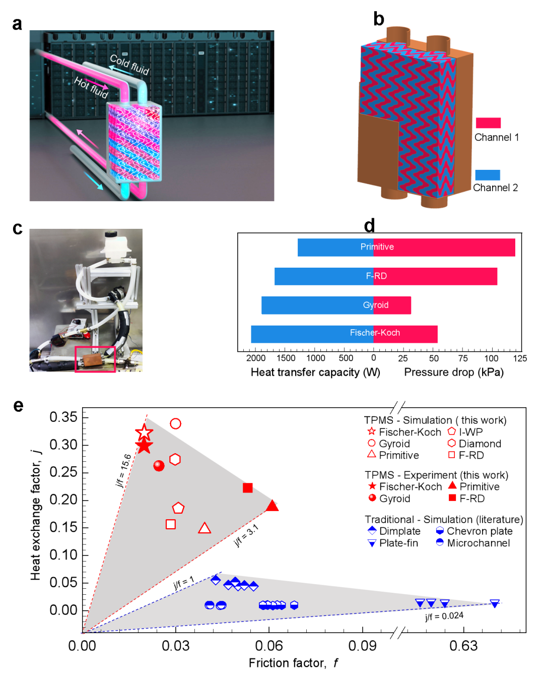 图5. 铜TPMS换热器的液冷热交换实验验证结果,表明其在实现高传热效率的同时显著降低流动阻力,体现出优异的综合性能(高j/f),验证了所提出设计方法的有效性。