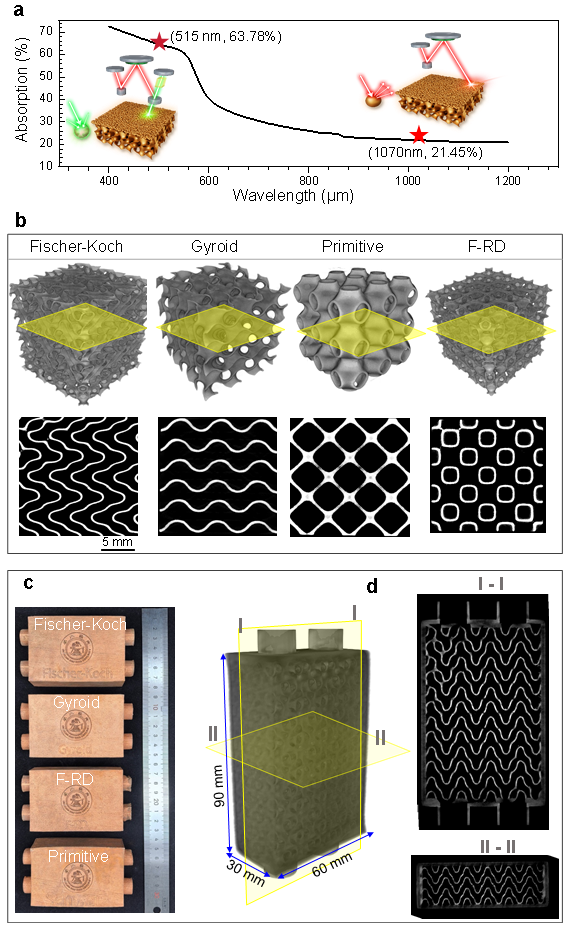 图4. 采用绿激光选区熔化(GL-PBF)技术制备高质量纯铜TPMS结构,展示其复杂三维流道的高精度成形能力及良好的结构完整性。