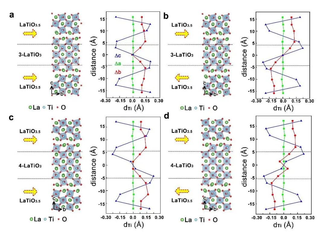 图2. LaTiO3.5/m-LaTiO3/LaTiO3.5多层异质结在不同极化构型下的原子结构