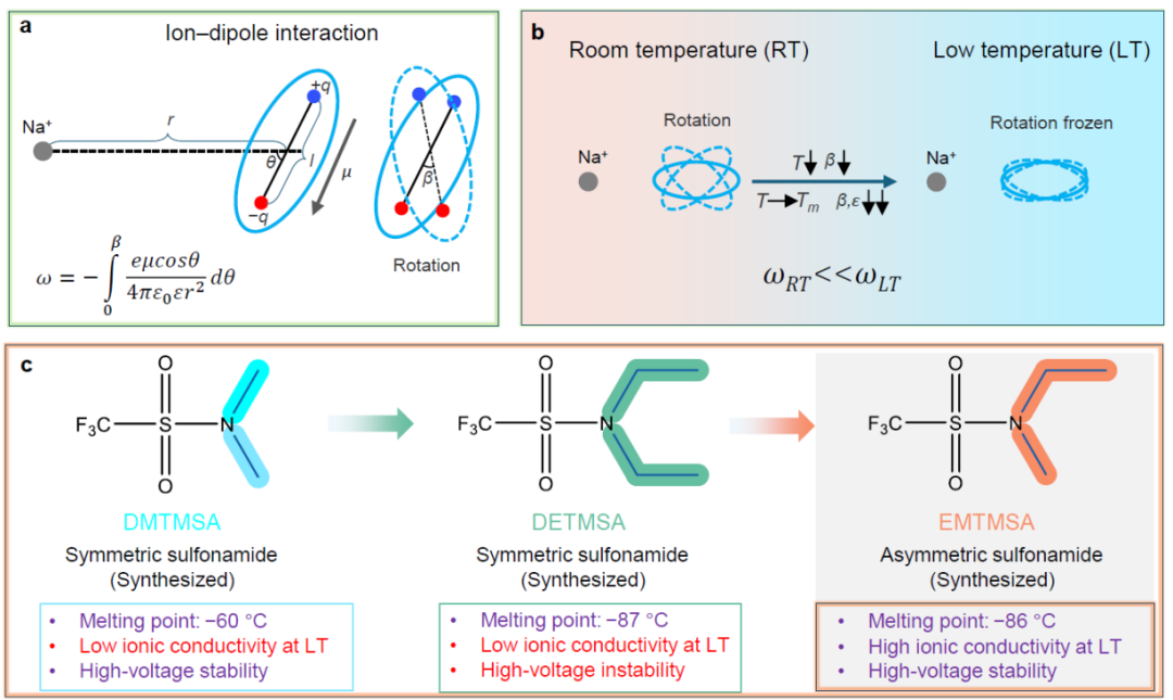针对上述关键科学问题,西安交大材料学院金属材料强度全国重点实验室微纳中心薛伟江教授课题组提出了一种基于“分子不对称结构设计”的新型磺酰胺电解液分子——N-乙基-N-甲基三氟甲磺酰胺(EMTMSA)。通过在磺酰胺分子中引入不对称烷基取代基,打破凝固时分子晶体的规则堆积,使其熔点降低至−86 °C,从分子层面实现低温流动性与高电压稳定性的协同优化。同时,该分子保留了类盐结构特征,在溶剂化结构中诱导形成以接触离子对和聚集体为主的溶剂化鞘,氧化还原分解时促进构建富无机、低阻抗稳定界面。