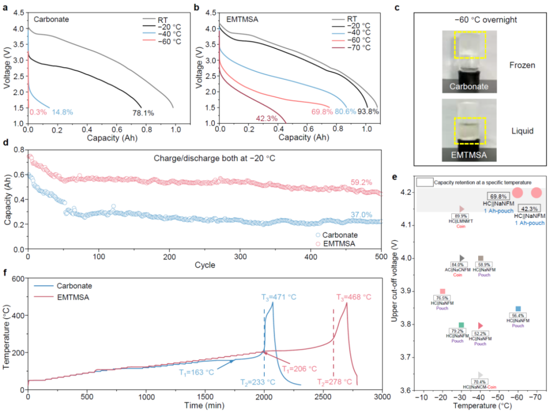 基于该分子构建的电解液在Ah级软包电池中展现出优异的综合性能:在4.2 VNa高截止电压下循环1000圈后容量保持率达81.6%,在4.15 VNa条件下循环1500圈后容量保持率达90.0%;在极端低温下仍保持优异放电能力,在−60 °C和−70 °C下分别可维持69.8%和42.3%的室温容量。同时,该电解液显著提升电池的高温稳定性与热安全性能,延迟热失控触发温度,实现宽温域(−70 °C至60 °C)稳定运行。