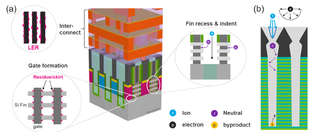 等离子体蚀刻在(a)逻辑栅极全环绕(GAA)晶体管和(b)存储类 3D-NAND 应用中的挑战示例。在 GAA 晶体管制造过程中,蚀刻工艺需制备兼具超高选择性、方向性和轮廓完整性的垂直与水平结构,需将亚 10 纳米尺度结构边角处的残留物及表面粗糙度降至最低。在金属线制备过程中,线边缘粗糙度(LER)的控制至关重要。对于存储类应用,等离子体蚀刻的挑战源于高纵横比(HAR)结构内各类粒子的传输问题,包括离子(+)、中性粒子(n)、蚀刻副产物(p)和电子(e)。