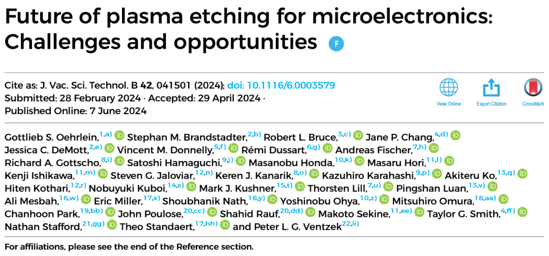 与光刻图案化、薄膜形成方法等技术一道,等离子体刻蚀不断动态发展,以满足推动现代社会发展的微电子产业呈指数级增长的需求。本文主要介绍 Future of plasma etching for microelectronics: Challenges and opportunities 这篇综述的主要内容,此综述汇集了从学术届到产业界(TEL、Lam 等)的各领域专家对不同主题的见解,这些主题将塑造未来微电子制造中的等离子体刻蚀技术。综述原文可至文末获取。