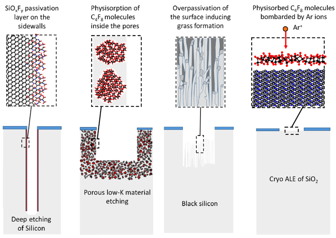 不同用途低温蚀刻工艺所得结构的蚀刻轮廓示意图。(a)硅的深度蚀刻:低温下在侧壁形成氧化氟硅(SiOₓFᵧ)层。(b)多孔低 k 材料的蚀刻:在 - 120℃下通过四氟环丁烷(C₄F₈)气体在孔隙内凝结,降低等离子体诱导损伤(PID)。(c)黑硅制备:在过钝化状态下产生微掩模效应,使硅表面形成 “草状” 结构。(d)二氧化硅(SiO₂)的低温原子层蚀刻(Cryo-ALE):通过分子在表面的物理吸附实现。