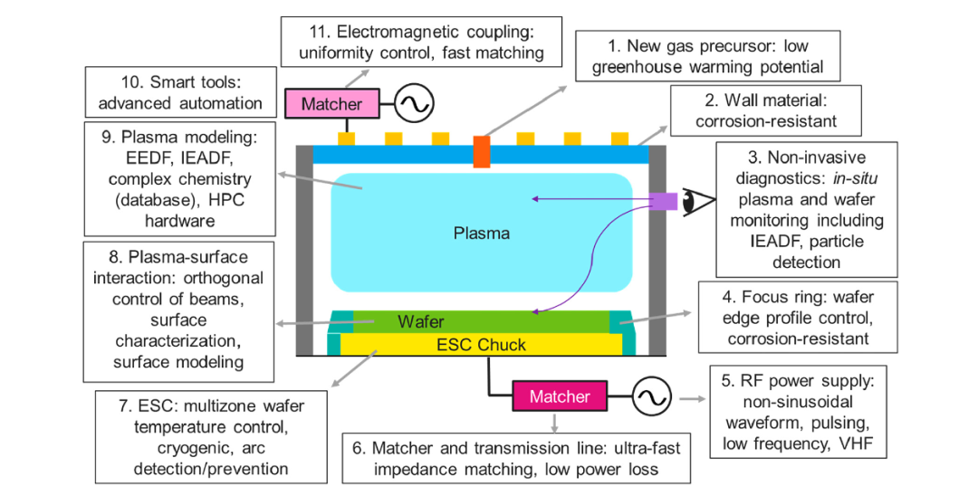 等离子体处理腔室示意图,标注了为应对未来器件缩放及新型架构挑战而需开展技术改进的关键部位。