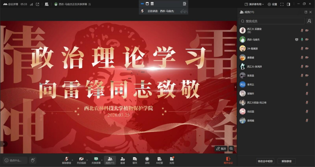 会议首先由西北农林科技大学植物保护学院学生会主席杨欢同学,组织进行主题团日学习。同学们深入学习雷锋同志立足本职、刻苦钻研的“钉子精神”,让大家对雷锋精神的内涵有了更深刻的理解。参会同学立志在学习和生活中主动帮助他人,勇于承担责任,努力成为有理想、敢担当、能吃苦、肯奋斗的新时代好青年。