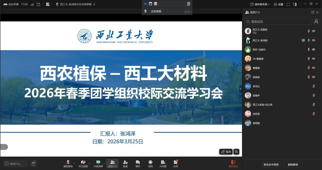 为了加强校际交流学习,3月25日晚7点,西北工业大学材料学院学生会与西北农林科技大学植物保护学院团委学生会,在线上围绕组织建设、工作创新等方面开展春季团学组织交流学习。