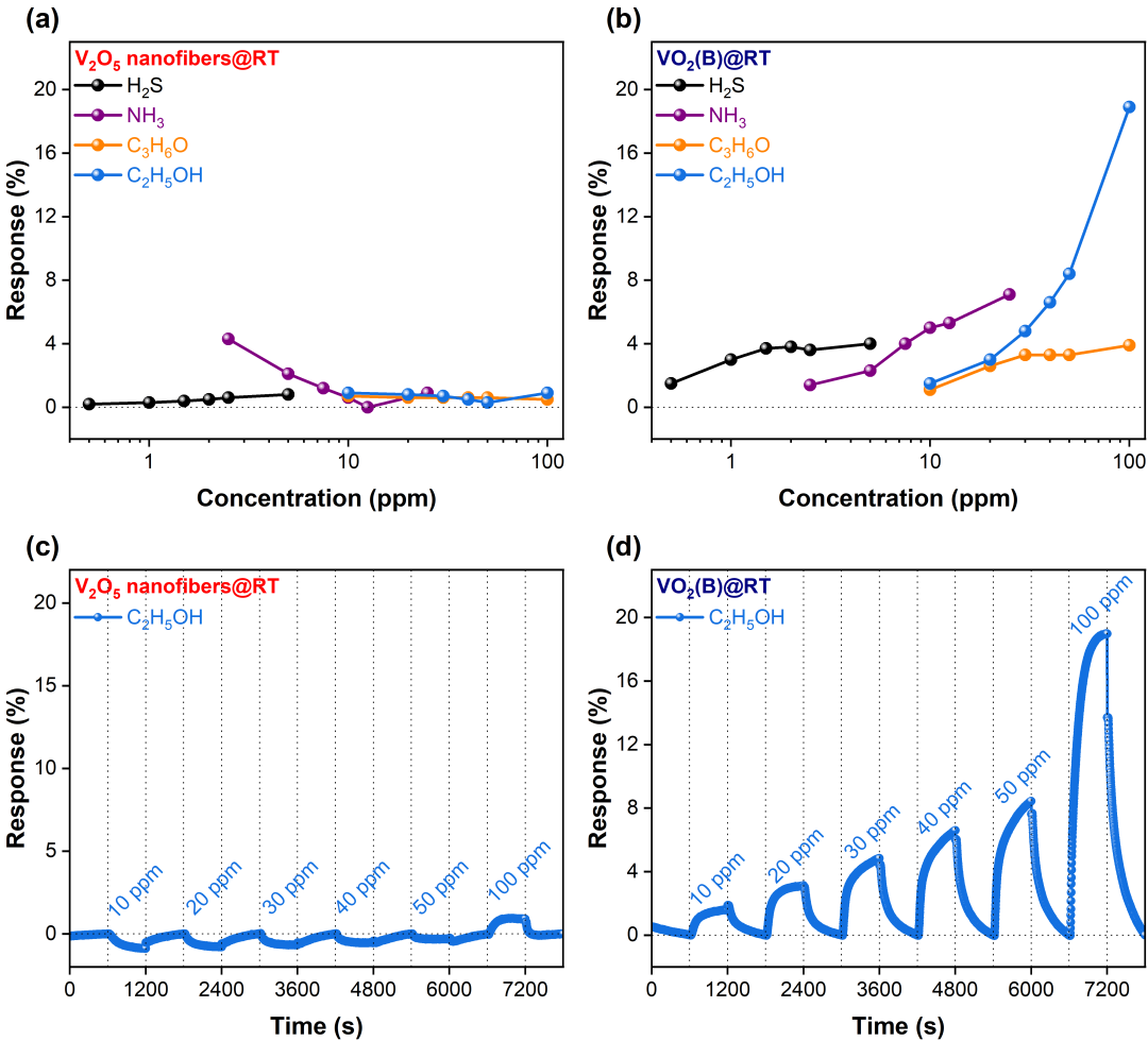 图4 (a) V₂O₅纳米纤维和(b) VO₂(B)在室温下对H2S、NH3、丙酮和乙醇的气体传感特性。(c)V₂O₅纳米纤维对乙醇(10–100 ppm)的动态响应曲线(插图:100 ppm 时的放大动态响应曲线);(d) V₂O₅纳米纤维和VO₂(B)在室温下对100 ppm乙醇的响应对比。((a)中显示的是绝对响应值。)