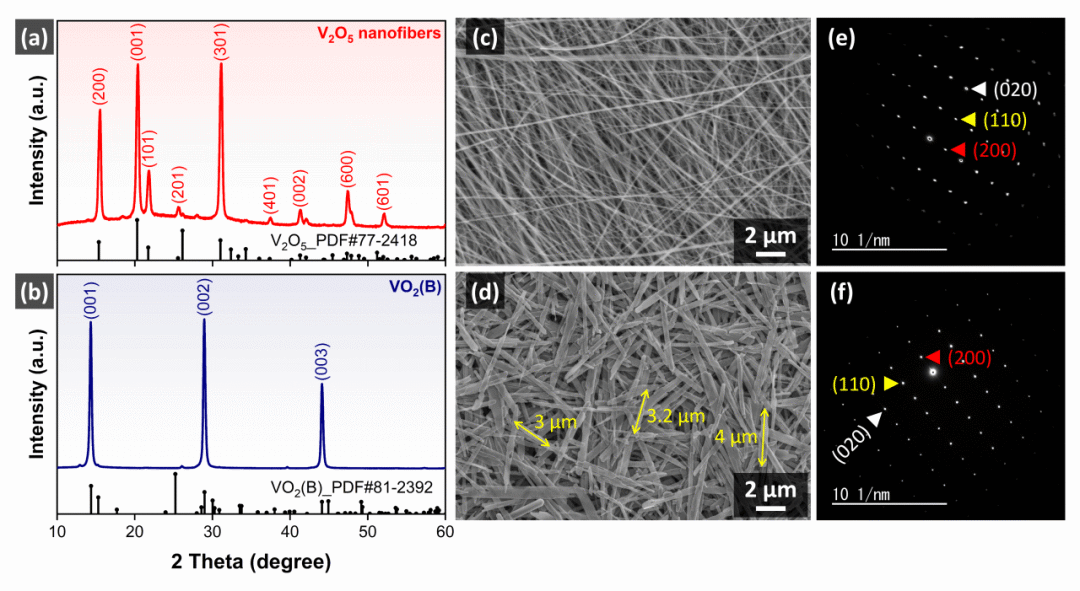 图2 五氧化二钒纳米纤维与B相二氧化钒的X射线衍射图谱(a,b)、扫描电镜图像(c,d)及选区电子衍射花样(e,f)。