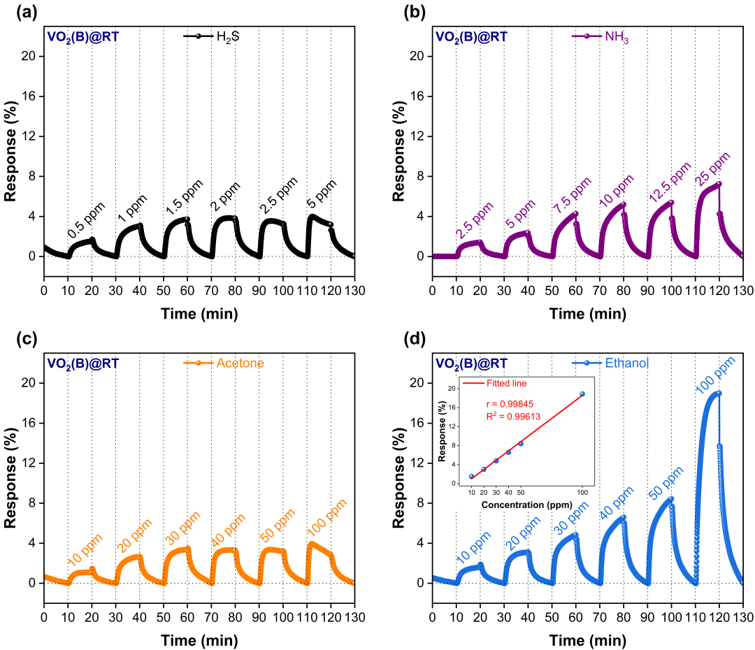 图3 VO₂(B)对(a) H2S (0.5–5 ppm)、(b) NH3 (2.5–25 ppm)、(c)丙酮(10–100 ppm)和(d)乙醇(10–100 ppm)的气体传感动态响应曲线(插图:拟合结果)。