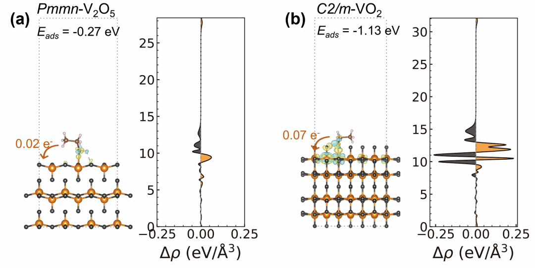 图5 乙醇在(a) Pmmn-V₂O₅和(b) C₂/m-VO₂(B)上的吸附电荷密度差和平面平均电子密度差图。黄色和青色区域分别表示电荷积累和耗尽,等值面水平为0.004 eV/ų。橙色、黑色、棕色和粉色球体分别代表V、O、C和H原子。