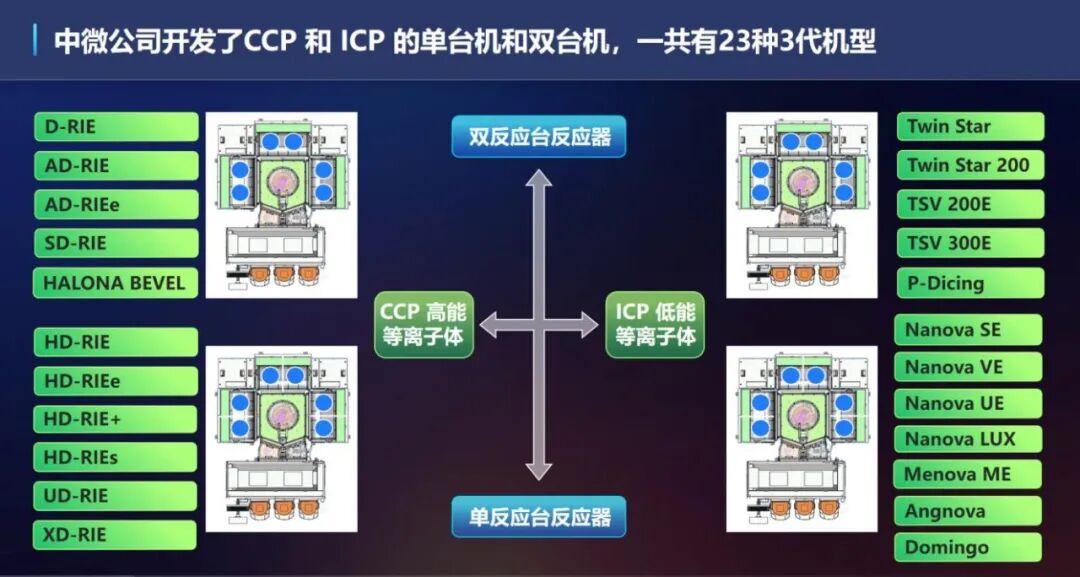 中微公司开发的 CCP 高能等离子体和 ICP 低能等离子体刻蚀两大类、包括二十几种细分刻蚀设备已可以覆盖大多数刻蚀的应用。中微公司的等离子体刻蚀设备已被广泛应用于国内和国际一线客户,从 65 nm 到 3 nm 及更先进工艺的众多刻蚀应用。