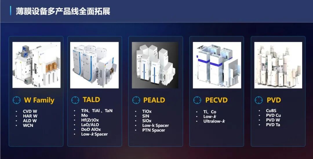 公司近两年新开发的 LPCVD 薄膜设备和 ALD 薄膜设备,目前已有多款新型设备产品进入市场并获得重复性订单。其中,薄膜设备累计出货量已突破 300 个反应台,其他二十多种导体薄膜沉积设备也将陆续进入市场,能够覆盖全部类别的先进金属应用;公司硅和锗硅外延 EPI 设备已顺利运付客户端进行量产验证,并且获得客户高度认可。