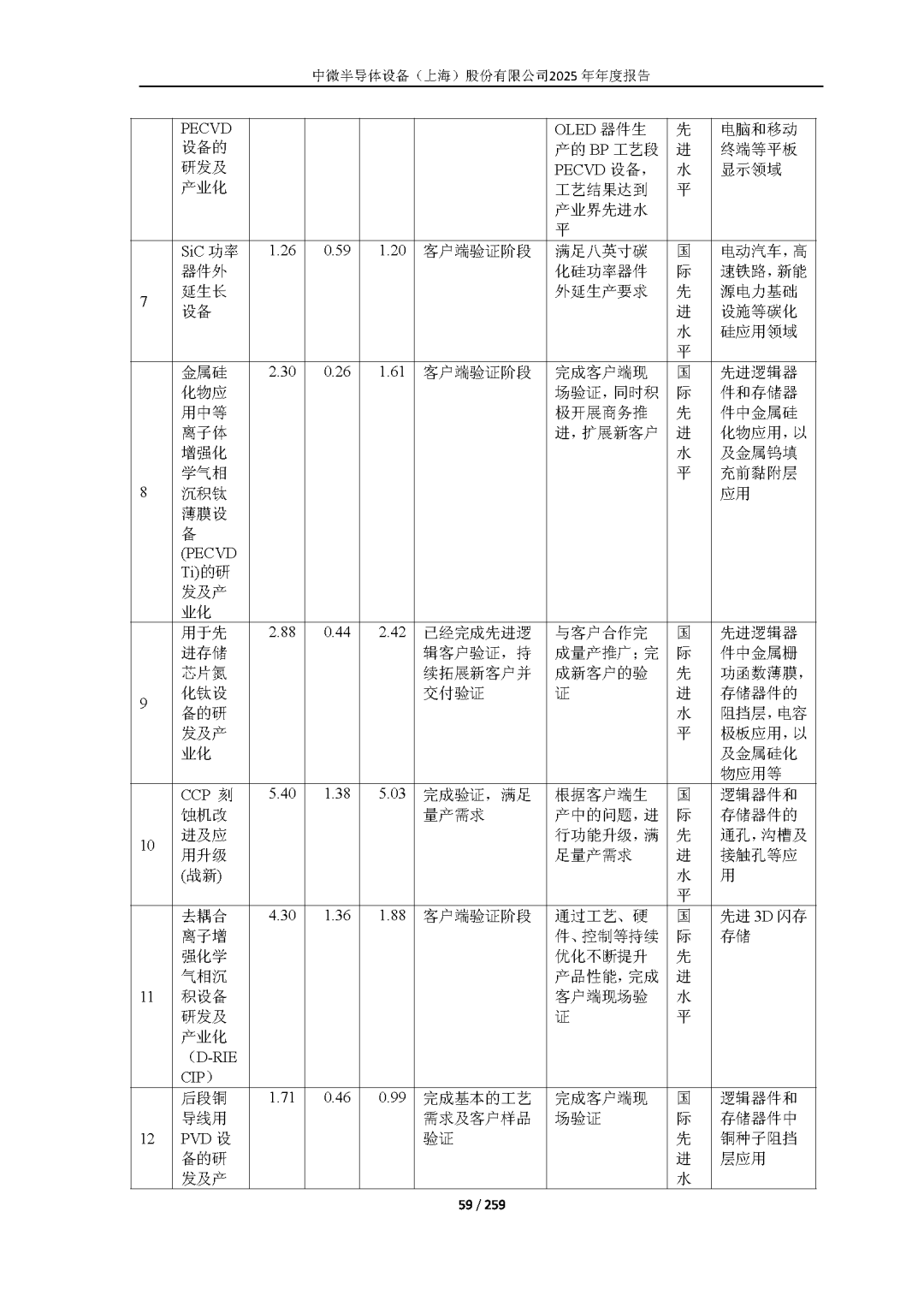 在 MOCVD 领域,用于氮化镓基 LED 外延生产的设备已在行业领先客户生产线上大规模投入量产,自 2017 年起已经成为氮化镓基 LED 市场份额最大的 MOCVD 设备供应商,牢牢占据行业内的领先地位。公司在 Micro-LED 和高端显示领域的MOCVD 设备开发上取得了良好进展,2025 年已完成行业头部 Micro-LED 外延公司的量产验证。公司正积极布局用于氮化镓基功率器件领域,新型 MOCVD 设备目前已发往下游客户进行量产验证,为 GaN 功率器件外延设备的国产化做好充分准备。另外,AsP 材料专用的 MOCVD 设备正在根据应用需求定制开发中,其中,面向红光 LED 和 Mini-LED 的 AsP 材料专用设备也已发往显示头部 IDM 公司进行量产验证,其他应用包括红光 Micro-LED、光电子材料外延等也正在逐步推进中。