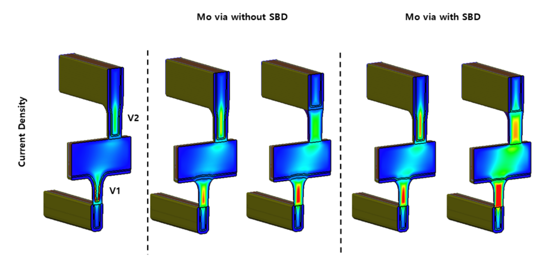 如图 2 所示,正如预期的那样,同时使用钼通孔和 SBD 技术的总电流密度要高得多,因为它们表现出更低的电阻值。