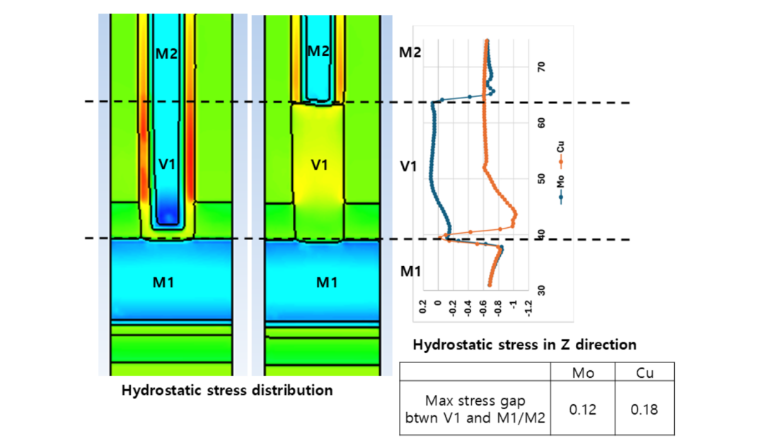 Lam 使用传统的铜双大马士革和钼混合方案研究了应力分布。与使用钼通孔方案相比,使用铜双大马士革方案时,M1 和 V1 之间在 Z 方向上的应力差距更大。这在通孔 V1 和阻挡金属层之间最为明显(见下图中的红色区域)。