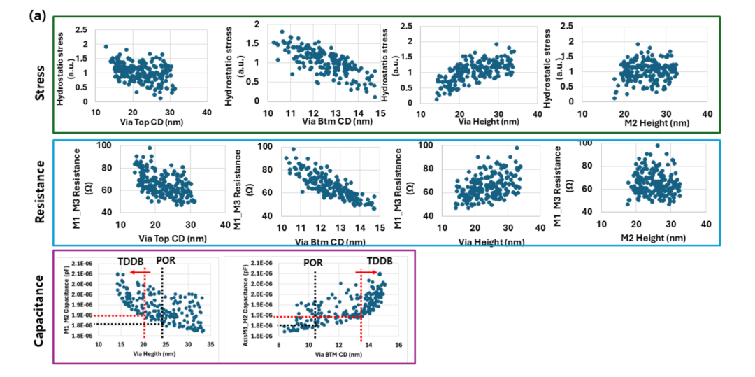 图6:不同工艺参数的敏感性分析及其对静水应力、M1-M3 电阻和 M1-M2 电容的影响。所分析的参数包括通孔顶部和底部的关键尺寸、通孔高度以及 M2,其中显示了用于电容的计量目标。