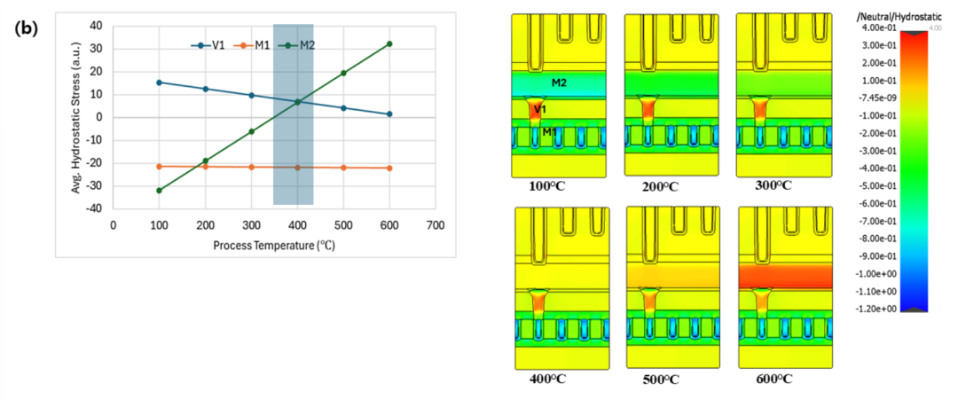 如下图所示,通孔的应力随温度升高而降低;然而,M2 应力却迅速增加。由于应力梯度较高可能会导致应力诱发空洞,在 Lam 的示例中,通过将温度保持在约 400°C,通孔和 M2 之间较小的应力值差异是更理想的。在较高温度下,M2 应力也可能从拉伸应力变为压应力。