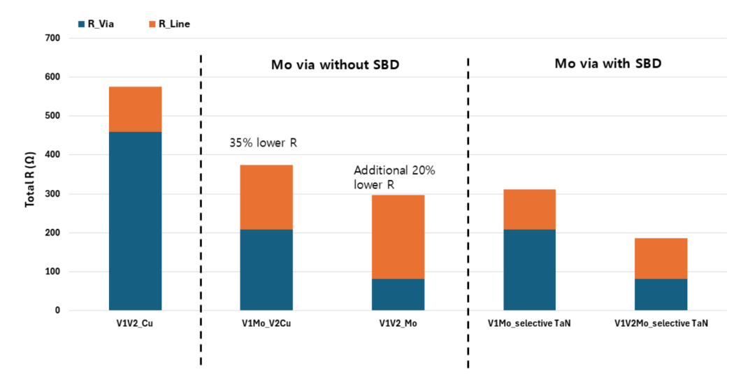 图 1 展示了不同金属通孔方案的通孔/线路电阻图表。在这个例子中,与传统的铜双大马士革工艺方案相比,钼混合方案的总电阻优势约为55%。