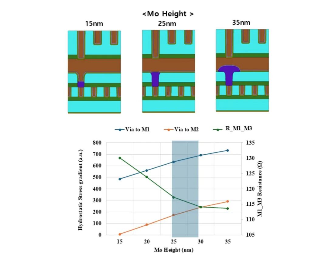 由于当钼(Mo)高度超过 25 nm 时,电阻斜率会趋于饱和,且随着钼高度的增加,铜/阻挡金属与钼之间的 M1 应力梯度会增大,因此最佳的钼高度可能是填充至通孔高度并满足电阻和应力目标所需的量。