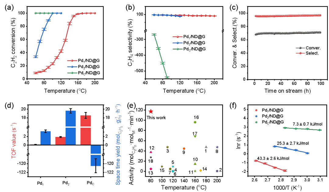 图2. 乙炔半加氢反应性能。(a)反应活性,(b)乙烯选择性,(c)长时间稳定性,(d)转化频率和时空收率,(e)比活性对比,(f)动力学活化能。