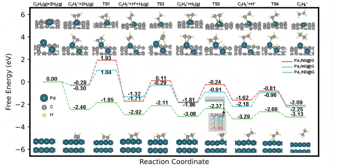 近日,中国科学院金属研究所沈阳材料科学国家研究中心刘洪阳研究员、特别研究助理洪峰博士与北京大学马丁院士团队、重庆大学孙耿副教授团队合作,成功在富缺陷石墨烯载体(ND@G)上构建了原子级分散的Pd2双原子催化剂(Pd2/ND@G),实现了高效的乙炔半加氢反应性能,为设计高性能加氢催化剂提供了新的思路。该成果发表于期刊《Nature Communication》(https://www.nature.com/articles/s41467-026-70107-w)。