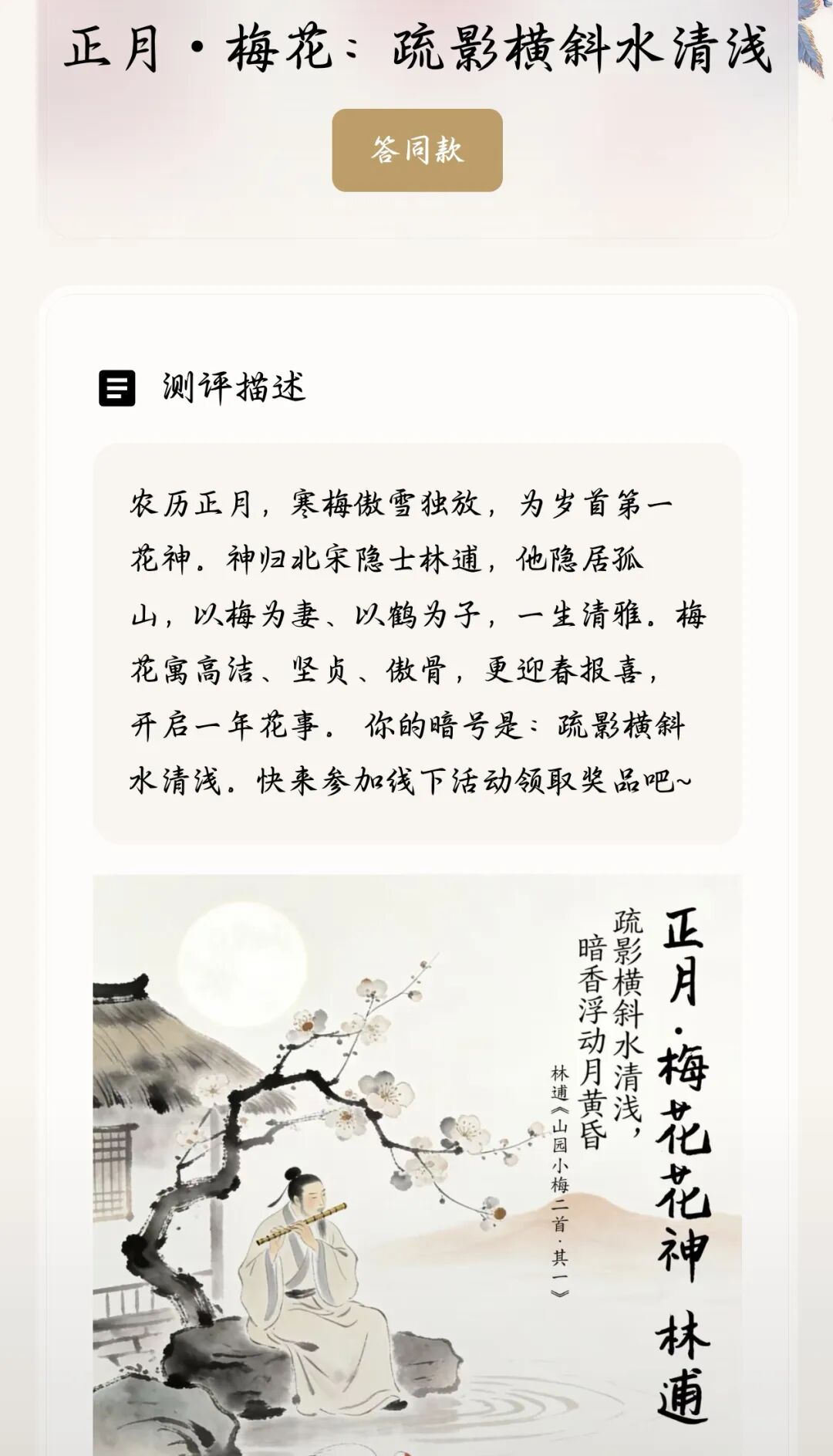 暗号抽奖环节:参与者通过前期线上“匹配花神”测评获得匹配结果页面上的半句诗词作为“暗号”,在线下活动期间凭此暗号到抽奖区对出下半句诗,即可参与抽奖。