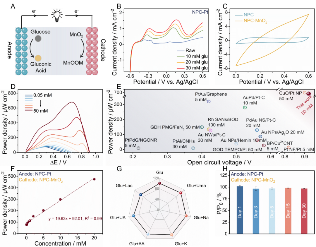 图4. 基于NPC-Pt阳极和NPC-MnO2阴极的生物燃料电池输出及自供能传感性能评估